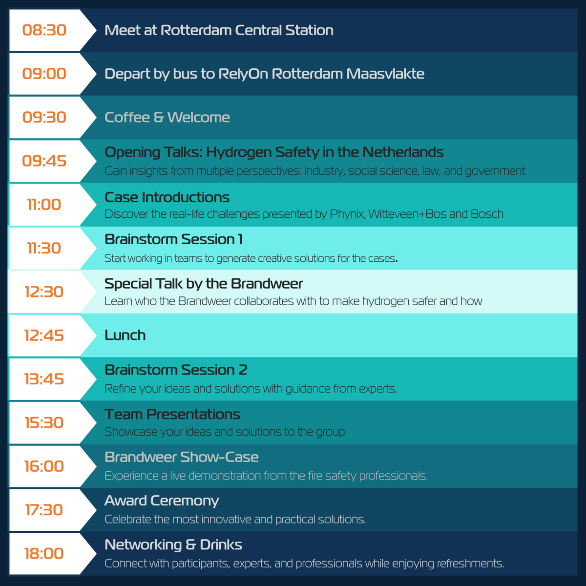 Throughout the day, you will be guided by experts from industry, fire safety specialists from Brandweer Rotterdam Rijnmond and social scientists. This combination helps you approach challenges from different perspectives.