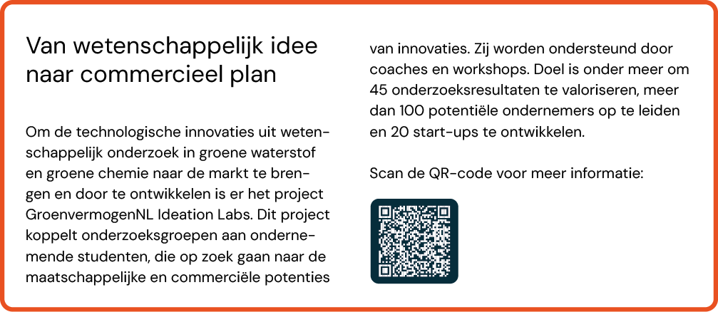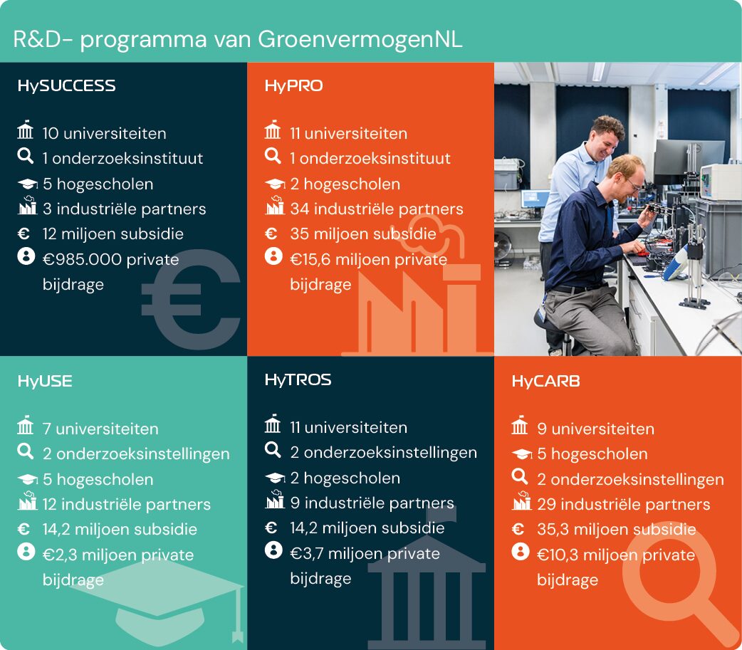 GroenvermogenNL geeft innovaties een impuls met een grootschalig R&D-programma. Vijf consortia van bedrijven en kennisinstellingen zijn inmiddels van start gegaan. Binnenkort volgen nog twee projecten in groene chemie. Daarnaast komt er een aanvullende call voor twee nieuwe initiatieven: één gericht op transport en opslag van waterstof, en één op direct gebruik.